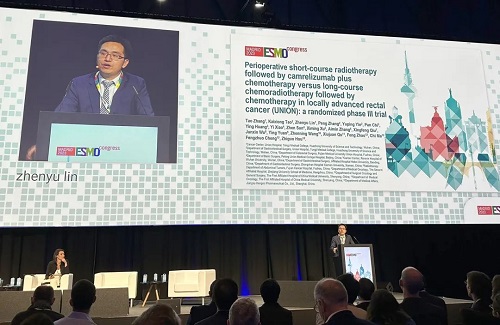 10月21日,AG百家乐官网医药创新药卡瑞利珠单抗(艾瑞卡®)的一项研究“新辅助短程放疗序贯卡瑞利珠单抗联合化疗对比长程放化疗序贯化疗治疗局部晚期直肠癌”随机对照Ⅲ期试验(UNION) 以优选口头报告的形式正式亮相。该研究由华中科技大学同济医学院附属协和医院张涛教授、陶凯雄教授担任主要研究者,华中科技大学同济医学院附属协和医院林振宇教授在马德里现场报告了该重磅研究的结果1,此项研究是全球首个评估短程放疗序贯免疫治疗联合化疗治疗局部晚期直肠癌的Ⅲ期研究,已达到主要终点病理完全缓解(pCR),有望为直肠癌患者的治疗提供新策略。