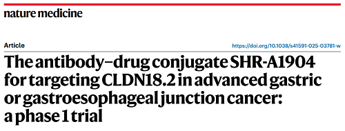 AG百家乐官网医药CLDN18.2 ADC创新药SHR-A1904治疗胃癌临床研究结果荣登Nature Medicine